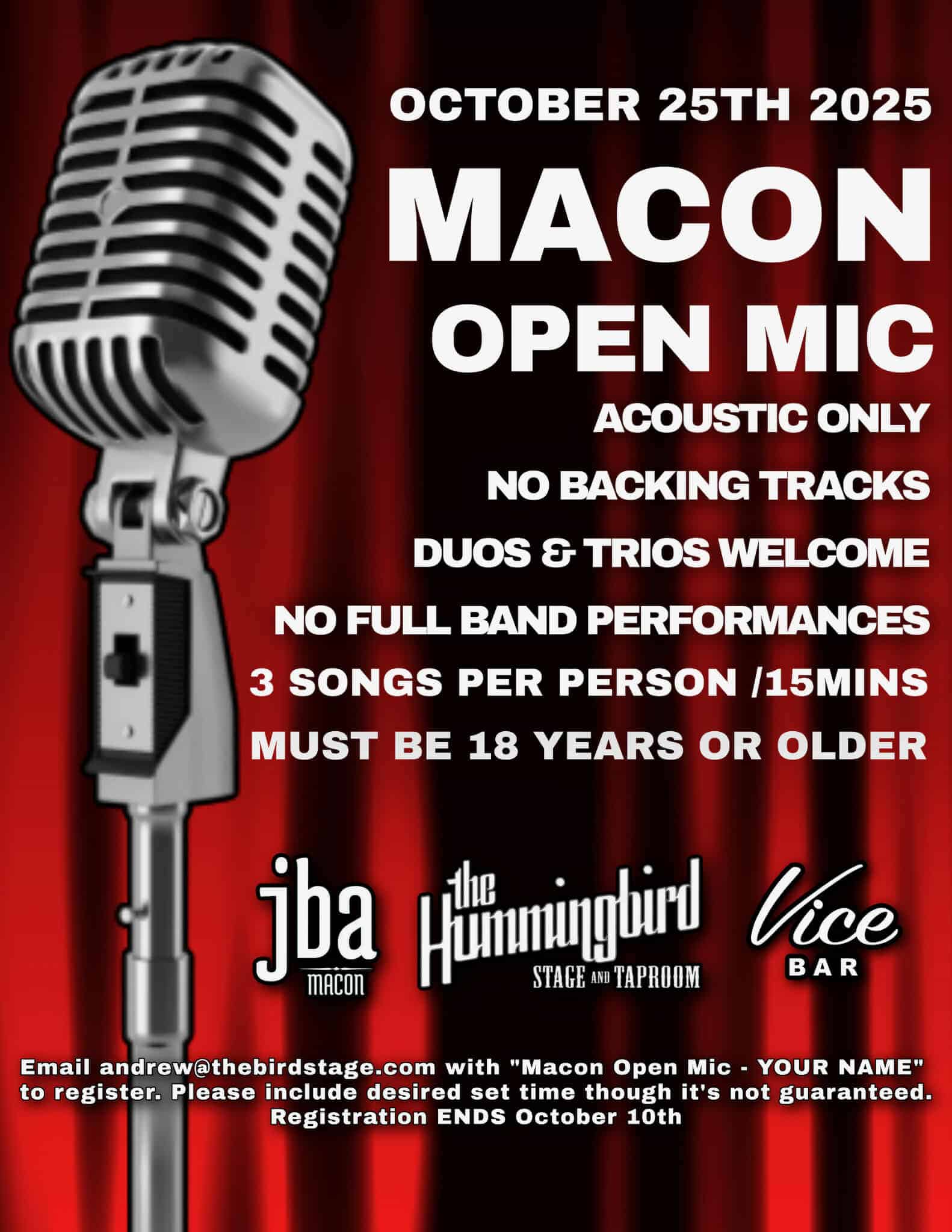 The Hummingbird Stage & Taproom, JBA, and Vice Bar are bringing back Macon's biggest Open Mic on Sat Oct 25th! We encourage everyone from gigging artists to the living room…