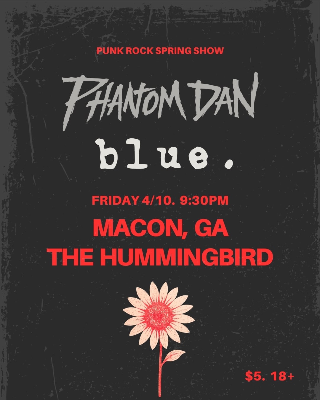 The Hummingbird 430 Cherry Street, Macon, GA, United StatesAthens pop punk band Phantom Dan and Milledgeville Emo band Blue take over The Bird on Friday April 10th! Music starts at 9:30pm!